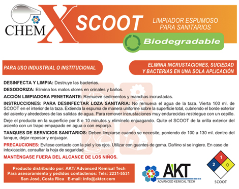 INSTRUCCIONES: PARA DESINFECTAR LOZA SANITARIA: No remueva el agua de la taza. Vierta 100 ml. de SCOOT en el interior de la taza. Extienda la espuma de manera uniforme sobre la superficie total, cubriendo el borde exterior del asiento y alrededores de las salidas de agua. Para remover incrustaciones muy endurecidas restriegue con un cepillo.